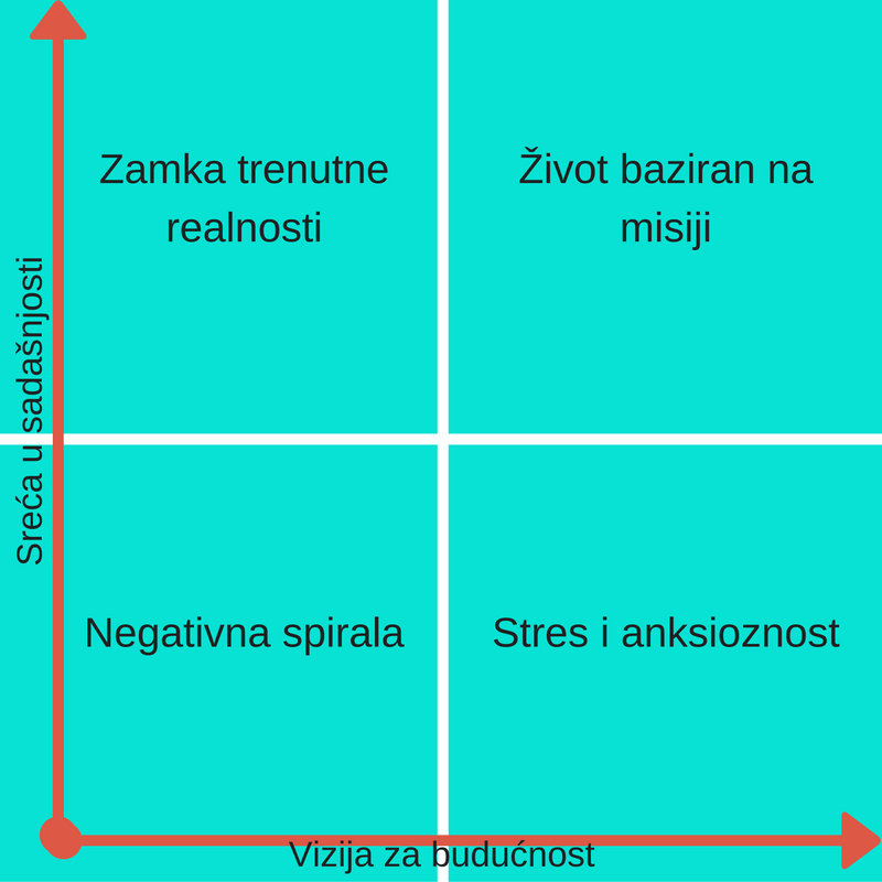 Tu upada ovaj graf (obožavam grafove toliko da mi je knjiga koju pišem bazirana samo na jednom grafu društvene promjene) koji nam objašnjava 4 stvari kroz svoje dvije osi- os x koja nam pokazuje viziju za budućnost odnosno aktivnosti koje nam to omogućavaju ili ne omogućavaju; te os y koja nam pokazuje sreću u sadašnjosti odnosno aktivnosti gdje smo sretni i aktivnosti gdje nismo.